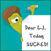 Description: Image of a green monster holding a sign that reads, "Dear LJ, today SUCKED!"