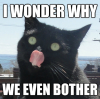 Description: Text reading "I wonder why we even bother" with an adorable licky-faced black cat in the background.