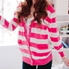 Description: Image: lady wearing a loose pink-white horizontal striped sweatshirt